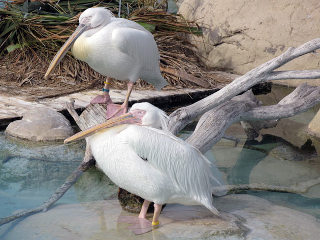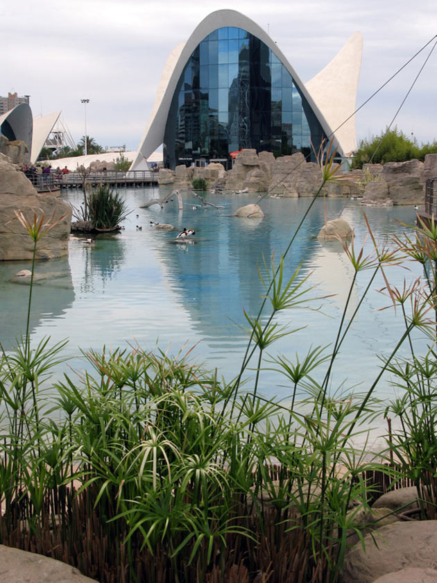 Proseguendo all’esterno, verso il biotopo “mediterraneo”, si costeggia una piscina/laguna architettonicamente molto bella, con uccelli acquatici come cormorani, pellicani e anatre selvatiche, l’ennesima conferma che in questo parco marino di Valencia il contenitore è decisamente più accattivante e curato rispetto al contenuto.