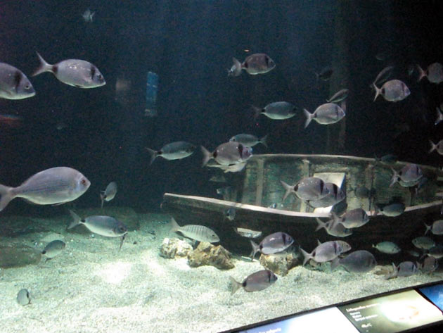 Entrando nell’edificio successivo si arriva alla sala dove sono esposte le vasche dell’ambiente mediterraneo. Alcune vasche sono decisamente scenografiche: una cilindrica con posidonie che rappresenta una basso fondale dei nostri mari ed una particolarmente grande con un mini-relitto affondato che ospita pesci pelagici.