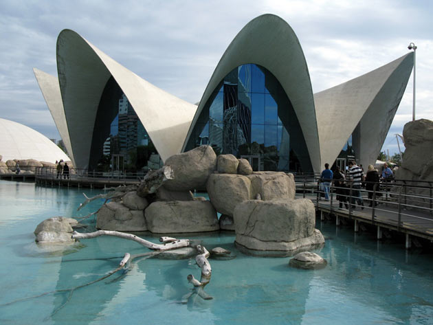 All’interno di questo ampio complesso sorge il Parco Oceanografico Marino, un’estesa area formata da svariati edifici e da zone aperte, che, secondo i loro ideatori e creatori, espongono le diverse zone e biotopi marini di tutto il mondo. Il parco marino di Valencia è il più grande d’Europa e si estende su una superficie complessiva di 100.000mq con all’interno oltre 500 specie esposte per un totale di oltre 45.000 esemplari ospitati. Al suo interno è presente un tunnel in acrilico di oltre 70 mt all’interno di una grandissima vasca che si sviluppa nell’ideale unione dei due versanti del mare tra Europa e America.