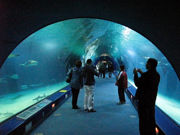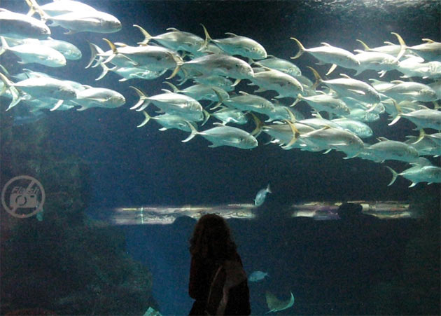 Un ampio tunnel attraversa la parte inferiore della grande vasca per tutta la sua lunghezza e camminandoci all’interno sembra di essere avvolti da questa moltitudine di pesci.