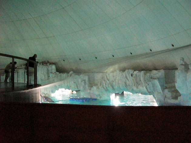 Uscendo dall’edificio ci si dirige verso l’ambiente artico ed è inevitabile passare accanto all’arena che ospita il delfinario dove vengono fatti esibire alcuni delfini tursiopi. Personalmente sono contro a questo genere di spettacoli e non trovo corretto parteciparvi se non altro per non incrementare la richiesta e la cattura di questi splendidi mammiferi. Il biglietto pagato all’ingresso comunque include anche lo spettacolo dei delfini, quindi l’accesso all’arena è aperto e gli spettacoli sono ripetuti a diversi orari.