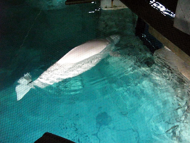 Per quanto ben fatta e per quanto spazio abbiano cercato di dare a queste due meravigliose creature, è assolutamente evidente di quanto soffrano la cattività. Il loro comportamento è apparentemente di tipo autistico, nuotando ciclicamente seguendo sempre lo stesso identico percorso o stazionando immobili col muso rivolto al muro. I beluga sono tra i mammiferi marini quelli con la gamma di vocalizzi più ampia ed articolata ed i loro fischi e urli che si lanciano l’un l’altro rimbombano di continuo all’interno dell’igloo aumentando la sensazione di tristezza nel vederli così rinchiusi.