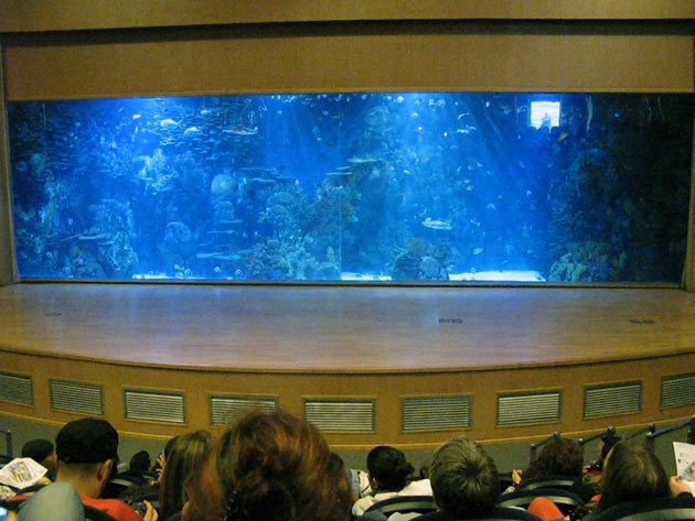 L’ultimo edificio che conclude la visita di questo parco marino è quello denominato “Mar rosso”. Mi aspettavo finalmente di trovare qualche vasca con bei coralli come poteva fare presupporre il nome. In realtà si tratta di un cinema/teatro nel quale proiettano documentari sugli ambienti marini e dove vengono tenute conferenze e seminari, anche a livello mondiale, in argomento. Come dicevo si tratta di un cinema/teatro, ma al posto dello schermo vi è una grande vasca tropicale con moltissimi pesci, di livello certamente superiore a quelle descritte all’inizio, anche se non posso dire se almeno qui i coralli fossero veri in quanto la distanza era troppa; di certo i colori non erano sfavillanti.