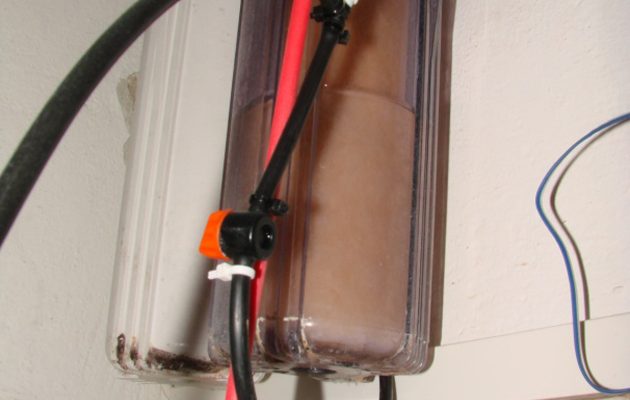Deviazione ricavata con una Tee e 2 rubinetti del tipo “gardena” questo per scegliere se mandare acqua in sump o alla tanica per fare nuova acqua salata Il sistema montato in questo esempio ha percorso oltre 18 metri dal bagno a dove è posizionata la vasca. Con un dislivello di circa 3 metri di altezza. Tale percorso dal momento in cui i galleggianti avviano l’elettrovalvola al momento di caduta dell’acqua di osmosi in sump è di 13 secondi. Da quando l’elettrovalvola chiude il circuito l’acqua smette di cadere in circa 8 secondi.