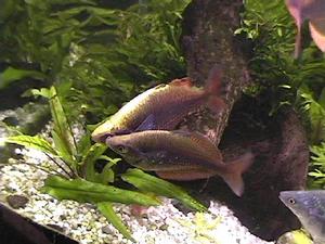 | La riproduzione Per scegliere i riproduttori dobbiamo fare attenzione a preferire quelli più robusti e vitali, dai colori migliori Evitiamo incroci che non portano mai a esemplari migliori dei genitori. Prima della deposizione facciamo attenzione alla dieta e se possibile adottiamone una varia e ricca anche di cibo surgelato facilmente reperibile nei negozi specializzati. Detto questo passiamo alla vera e propria riproduzione. Come ho avuto modo di dire gli accoppiamenti avvengono principalmente la mattina. Il maschio invita la femmina in un angolo prescelto ( non ho mai capito se è il maschio che sceglie o la femmina che si fa scegliere), e qui avviene un rapido sfregamento con espulsione simultanea di uova e sperma. Le uova si attaccano al substrato con un filamento. Questo mi fa pensare che in natura questa particolarità da modo di deporre le uova anche in torrenti con acque anche turbolente. Sostanzialmente ci sono due modi di ottenere la deposizione. Il primo è quello di allestire un acquario apposito ed introdurvi i riproduttori. Attendere che questi facciano il loro dovere, poi togliere questi e aspettare che sguscino gli avannotti. Secondo metodo : individuare i punti dell´acquario dove i maschi portano le femmine a deporre e qui inserire vasetti di piante filiformi come i muschi o, ancora più pratico, inserire delle trecce di fibra sintetica.