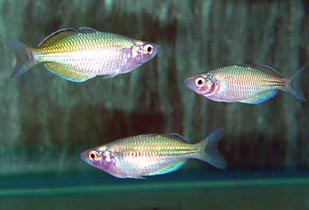 Dopo i primi giorni gli avannotti accettano le artemie saline appena sgusciate e dal momento che imparano a predare questi minuscoli crostacei il problema dell´alimentazione diventa tutto più semplice. Sarà sufficiente fare cambi parziali d´acqua affinchè il marcire del cibo non consumato non comprometta il nostro lavoro. Col passare dei giorni dobbiamo integrare con altri tipi di cibo per una più sana alimentazione e una rapida crescita. Ho detto rapida crescita impropriamente, infatti i Ranbowfishs sono relativamente lenti nella crescita. In genere occorreranno diversi mesi se tutto va bene per avere esemplari adulti, ma ne vale la pena. |