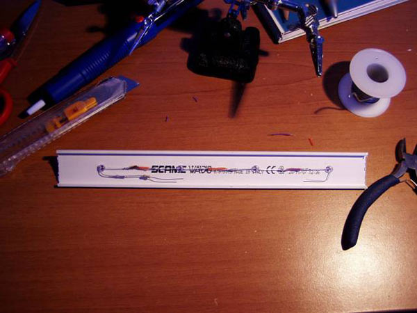 Dopo aver saldato i componenti su una basetta millefori, si procede all’inserimento del circuito e del relè, all’interno di uno spezzone di canalina in plastica (io ho usato un pezzo da 25cm), di quelle che si utilizzano per coprire cavi elettrici. Cercate di utilizzare una canalina abbastanza capiente, evitando la scelta che ho fatto io per il semplice motivo che avevo già questa a disposizione, e che mi ha obbligato a lavorare in spazi molto limitati.