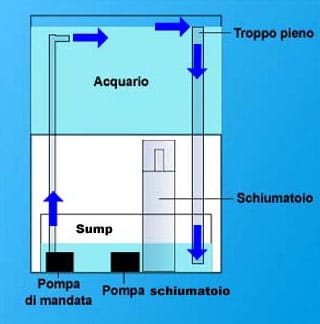FunzionamentoIl sistemaL’acqua dell’acquario tracima per troppo pieno e cade nella sump sottostante. L’acqua viene prelevata dalla pompa dello schiumatoio, immessa nello schiumatoio e trattata. A questo punto l’acqua passa attraverso i filtri meccanici e riscaldata dal riscaldatore. L’acqua pulita e riscaldata viene quindi riimmessa nell’acquario tramite la pompa di mandata, facendo ricominciare il processo.