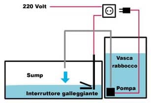 L’osmoregolatoreUna vasca aperta provoca una forte evaporazione. Essendo l’acquario munito di troppo pieno, in caso di diminuzione del quantità d’acqua nel sistema (evaporazione), il livello dell’acqua non si abbasserà nell’acquario ma nella sump. Un abbassamento eccessivo rischierebbe di far andare a secco le pompe, danneggiandole. Inoltre l’assenza di un sistema automatico di rabbocco ci impedirebbe di allontanarci per più di qualche giorno dall’acquario, in quanto l’acqua andrebbe rabboccata manualmente di frequente.Con l’osmoregolatore quando il livello dell’ acqua diminuisce nella sump, l’ interruttore galleggiante da l’impulso alla pompa posizionata nella vasca di rabbocco che immette acqua nella sump ripristinando il livello.