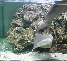 Le rocce vive inizieranno a produrre delle sostanze inquinanti e sostanze polverose di rifiuto. A questo punto è importante che lo schiumatoio sia perfettamente tarato ed il bicchiere costantemente pulito (anche più volte a settimana); un bicchiere sporco rende infatti inefficiente lo schiumatoio. Iniziate a pulire anche i filtri meccanici settimanalmente. Le sostanze polverose tenderanno a depositarsi sulle rocce vive, rischiando di soffocare le alghe e gli organismi sottostanti. Le rocce andranno tenute pulite, soprattutto durante questa prima fase. Per pulirle si agita l’ acqua (con la mano o con una piccola pompa) in prossimità della loro superficie. I fanghi sollevati tenderanno a depositarsi sul vetro di fondo dell’ acquario.