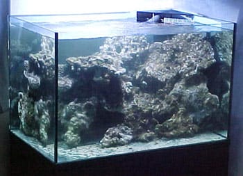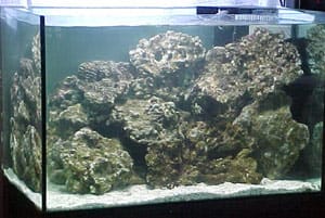 Dopo l’introduzione del sale abbiamo lasciato girare la vasca per qualche giorno. Dopo una settimanaAggiunti 30 Kg di rocce vive in modo da realizzare una struttura con grotte anfratti e zone piatte a gradini a più altezze per il posizionamento futuro degli invertebrati. Gli invertebrati che hanno più esigenza di luce andranno posizionati nelle zone alte e viceversa.