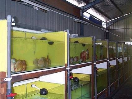 La visita arriva al termine, ma la giornata non è ancora finita, ci aspetta una cena tipica e la compagnia di alcuni allevatori che mangeranno con noi. Qi Kim Hu Aquarium The Simon Pak Story From hobbyist to a professional breeder, Simon Pak has been rearing Discus for ten years now. However, he only turned ‘professional’ back in 1998 and has already won a total of 13 awards in Discus competitions held locally within these two short years. A commendable feat for someone ‘new’ in the business. His winning Discus in top three positions consists of Snakeskin, Ruby Spotted Red and Golden Discus. It was passion and long experience in Discus keeping that Simon decided to start his own aquarium shop. Nestled in a little cosy corner in Woodlands Grove market lies Simon’s pride and joy his aquarium shop which specialises in Discus fish. Simon prefers and thus concentrates mainly on Discus rearing because of its unique and attractive coloration. Besides keeping Discus, he also breeds his own Discus. Simon emphasizes that water condition is critical and of utmost importance in rearing Discus. This is because Discus is particularly sensitive to the pH value of the water in the tank. To produce top quality Discus, the pH value in the tank should also be maintained at the range of 6.5 ° 7.0 and the water must always be kept clean and clear. A distinguished feature of Simon’s Discus is its well-built high body and the bright colouration. The secret to this is Simon’s secret ‘recipe’ beefheart, which is fed to his Discus. However, not content with just an aquarium shop and to stay ahead and expand, Simon formed a partnership with Mr Hong Kok Leong to set up a Discus Farm in Lim Chu Kang in May this year. His partner, Hong, shares the same philosophy and standard as him. Quality control is essential in the farm. Owning a Discus farm has always been Simon’s dream. With the farm and its activities, they plan to raise the standard of Discus keeping in Singapore as well as breed a more original range of Discus with clearer designs and color intensity. Like other breeders, both are committed to their farm in Singapore on a long term basis. Their objectives are to increase the standard of their Discus stock, import new bloodline and crossbreed their stocks to improve and create new strains and color varieties.Simon and his partner plan to specialise in stripped, spotted and solid yellow Discus. Simon’s strength is to produce high quality Discus by improving the colour base and body patterns of his fish. The Discus farm has a capacity to contain up to 300 standard Discus tanks. No efforts have been spared to ascertain high water standards. It has a conducive environment to provide proper water treatment system. A special room in the farm has also been devoted to Discus breeding. In fact, the technical aspects of the farm are attended to seriously. Besides the farm activities, Simon and his partner plan to export and import quality Discus around the world. They also plan to launch a web site in the internet to market their product and services to the world. The future holds a lot promise for Simon and his Discus farm & a man whose work is his passion.