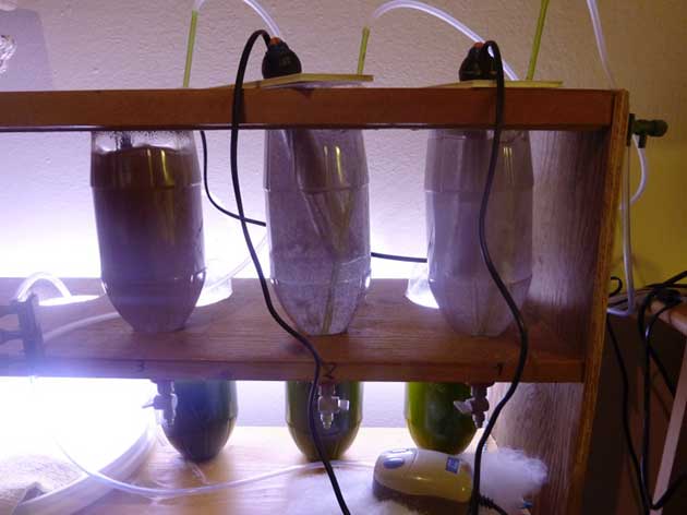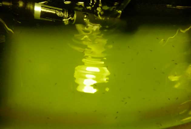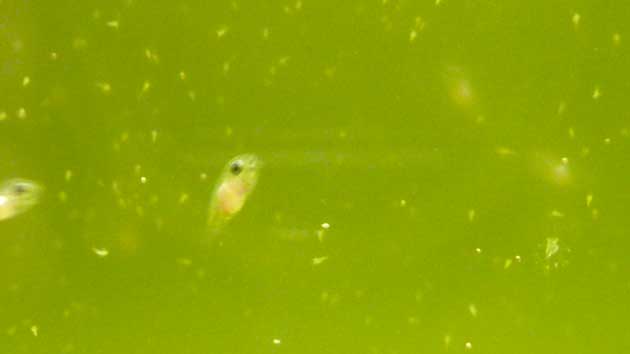 Dopo circa mezz’ora, quando nella vasca principale non ci sono più avannotti, tappo il buco lascio andare ancora un pò la pompa per svuotare un po’ la vaschetta dopo di che prendo la stessa e molto lentamente verso l acqua e piccoli in un’altra di 2 litri già preparata in precedenza con acqua dell’acquario e fitoplancton al di sotto di questa tenuta alta 10 cm. dal tavolo con quattro barattoli di vetro posiziono uno specchio che uso per vedere gli avannotti morti che in acqua verde sarebbe impensabile vederli. Vaschetta illuminata da subito 24 su 24 fino al 30° giorno con una lampadina da 4000 kelvin, poi andando a diminuire fino a 15 ore circa. SVEZZAMENTO