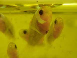 Quando i piccoli iniziano a fare la seconda striscia bianca circa 15-20 giorni e dopo aver lasciato i piccoli un paio d’ ore senza mangiare inizio con cibo secco piccolissimo di varie marche SHG (microperle 50 micron) – Cyclop-eeze – Tetra che alterno con l’ artemia.