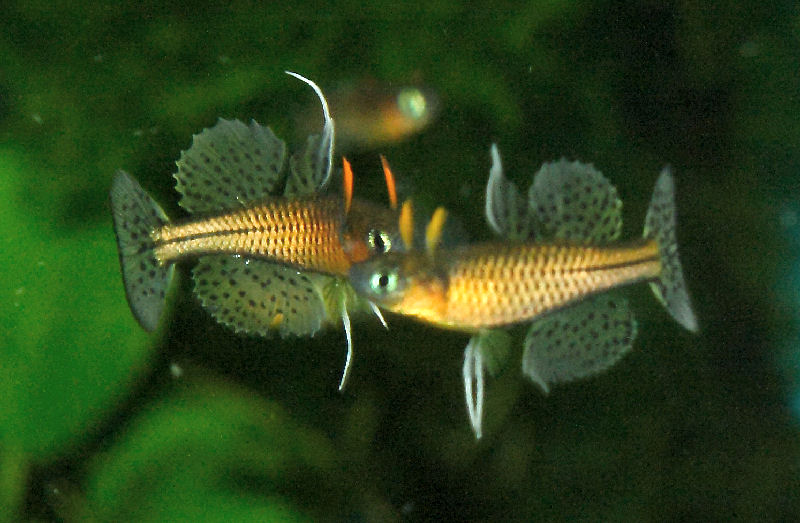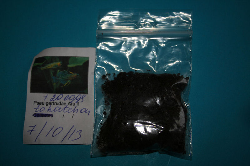 [In questo filmato sono visibili maschi in parata. Adulti di circa tre mesi.] I valori delle acque che costituiscono l’habitat naturale di questi pesci variano anche con le stagioni. La riproduzione avviene quando le temperature, prima dell’estate, iniziano ad innalzarsi. Alcuni acquariofili raccomandano una variazione delle temperature tesa a ricreare il ciclo stagionale. In acquario è riferito che le uova vengono deposte con temperature superiori a 24 °C. Personalmente ho avuto deposizioni a 21 °C. Il dimorfismo sessuale è ben evidente, con i maschi più appariscenti per colori e lunghezza delle pinne. Durante l’accoppiamento è possibile assistere alle parate dei maschi che mostrano agli avversari le loro pinne spiegate, mentre invitano le femmine a seguirli nella vegetazione più fitta o nei mop predisposti per raccogliere le uova deposte.. La schiusa può richiedere anche una decina di giorni di incubazione. Il tempo varia al variare delle temperature dell’acqua. Non avevo mai visto questi pesci nei negozi che frequento. Ho iniziato a cercarli in tutti i negozi di acquariologia più grandi della mia regione, ma senza risultati. Ho chiesto a qualche amico e ho provato a scrivere a alcuni negozi, ma non sono riuscito nel mio intento e dopo un paio di mesi di ricerca infruttuosa, quando stavo per desistere, ho digitato su un famoso motore di ricerca per acquisti online le parole “Pseudomugil gertrudae”. Con mia grande meraviglia ho trovato un venditore nel Regno Unito che aveva messo in vendita 20 uova! Non ho resistito. Le ho comprate spendendo per acquisto e spese di spedizione 20 euro. Sapevo che le uova dei killifish vengono spedite per posta, in genere contenute nella torba in cui sono state deposte, anche se non avevo mai pensato di comprarle (soprattutto perché non avrei potuto far fronte alle difficoltà di alimentazione dei killi). Tuttavia non immaginavo che si potesse fare la stessa cosa con altre specie.
