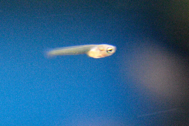 Dopo 15 giorni ho smesso di somministrare naupli e ho inziato a somministrare Tetra min baby®. Gli avannotti lo mangiavano con maggior appetito. [Avannotti a 22 giorni dalla nascita mentre mangiano cisti di Artemia decorticate.] Dopo 31 giorni dalla nascita (dall’avvistamento delle larve nella vasca) gli avannotti più grandi erano lunghi più di 2 cm e i più piccoli qualche mm in meno.