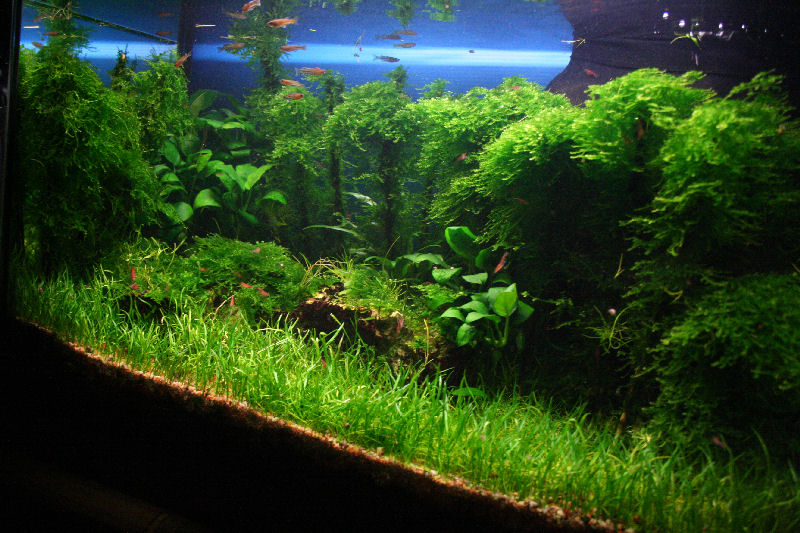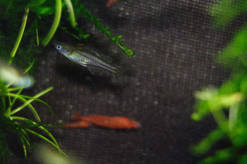 Decisi di spostare gli avanotti nell’acquario cui sarebbero stati destinati: 60 lt ben ricco di vegetazione e con un centinaio di Neocaridina heteropoda (red cherry). Non avevo timore per il filtro che il potesse aspirare le larve, perché protetto da una calza che già mi assicurava la riproduzione delle red cherry senza perdite.