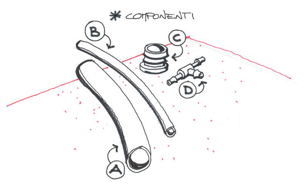 seguendo lo schema grafico di assemblaggio innestiamo tutti i componenti, che non richiederanno l’uso di collanti. L’unica accortezza dovrà essere quella di dimensionare, ed eventualmente accorciare, il tubo più piccolo secondo l’altezza del nostro tubo di ripresa del filtro (e dell’altezza della nostra vasca).