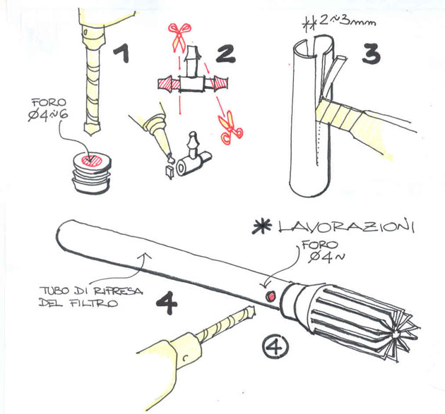 1) utilizzando un trapano, con una punta del diametro del tubo capillare, forare il tappo A come da disegno.