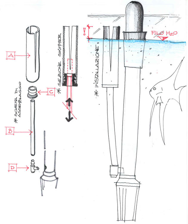 Come visibile nella sezione, questo tubicino può comunque scorrere all’interno dello “skimmer”, permettendo di correggerne le quote anche in vasca.