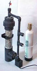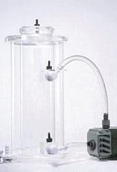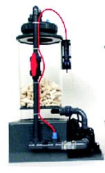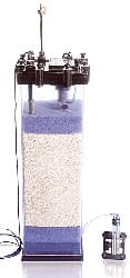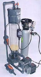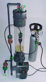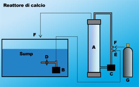 Il reattore di calcioIl reattore di calcio è costituito da una colonna di contatto riempita di materiale calcareo (sabbia corallina o carbonato di calcio in granuli). All’interno del reattore vengono introdotte in esigue quantità anidride carbonica proveniente da un impianto di CO2 ed acqua proveniente dall’acquario prelevata da una pompa. L’acqua che alimenta il reattore può essere prelevata da una diramazione di una pompa utilizzata per altri scopi (ad esempio la pompa del filtro), od una pompa utilizzata appositamente. Utilizzando quest’ultimo metodo si riesce, con l’ausilio di un rubinetto che ostruisce parzialmente l’uscita dell’acqua, ad aumentare la pressione all’interno del reattore, favorendo il legame di CO2 all’acqua e riducendone il consumo.