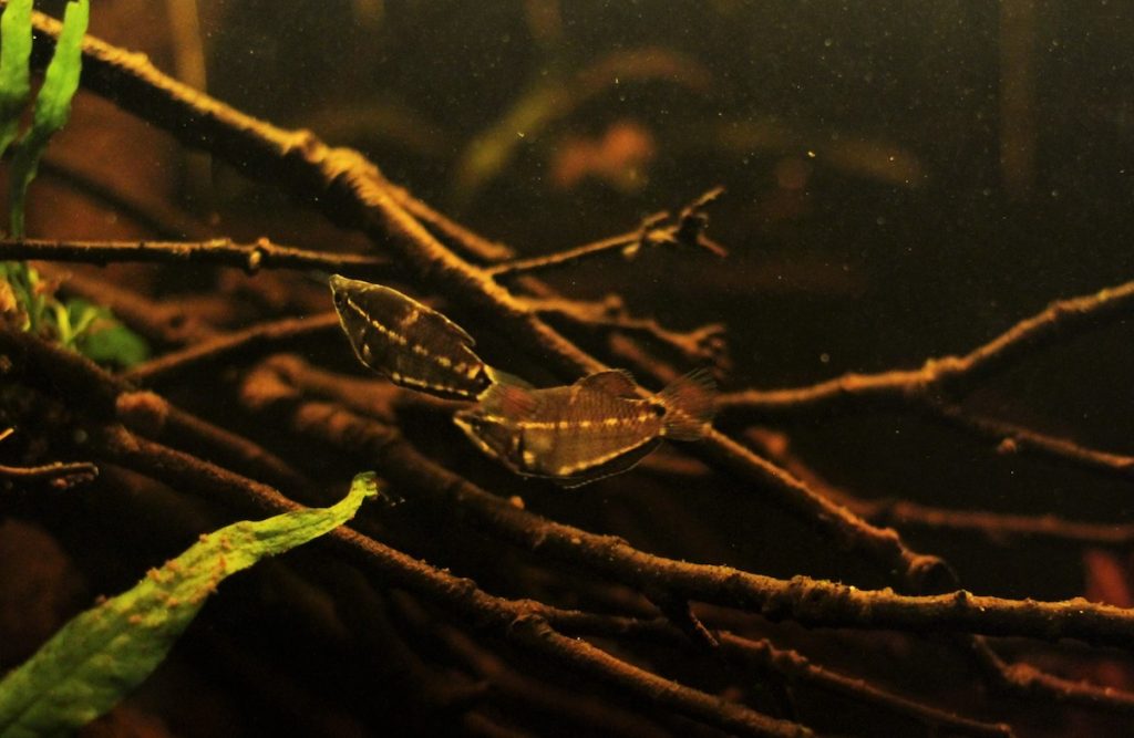 Nel mio acquario ho tentato di riprodurre tutto ciò utilizzando dei legni prelevati in natura, che simulano le radici fuori terra di un albero che cresce sull’ansa del fiume. L’acqua è tenera, quasi esclusivamente di osmosi, la conducibilità si attesta inferiore a 50 µS/cm. Il fondo come in natura è composto da sabbia fine, ricoperta da detriti e foglie secche, cadute dagli alberi, e in decomposizione.