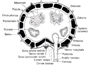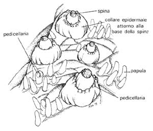 Uno strato muscolare costituito da fasce di forma circolare e longitudinale giace sulla parte inferiore dell’epitelio peritoneo, quest’ultimo caratterizzato da cellule munite di ciglia vibratili; tale massa muscolare si trova a stretto contatto con il derma situato in posizione sovrastante rispetto allo strato nervoso. Nello strato più superficiale del derma sono ravvisabili delle placche calcaree a mò di finestrella, che insieme ad aculei e protuberanze sporgenti esternamente, formano l’endoscheletro.