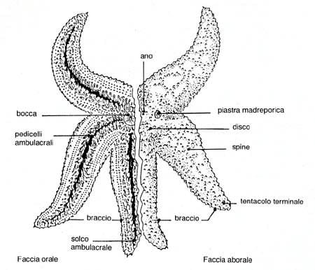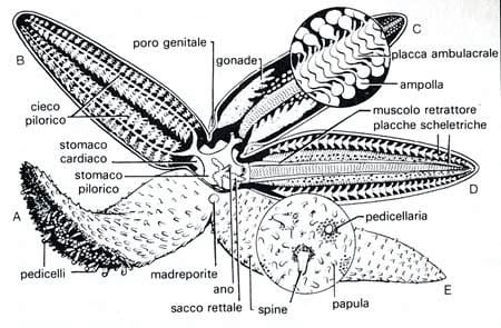 Sistema nervoso e organi di senso Il sistema nervoso degli Asterodi è racchiuso nell’epidermide, e consta di 2 parti differenti identificate in 2 strati di neurofibrille: sistema nervoso ectoneurale e sistema nervoso iponeurale. Il primo rappresenta la parte principale del sistema nervoso, ed è costituito da un anello pentagonale posto nella membrana peristomiale, che concorre alla formazione di un cordone nervoso radiale (formati da fibrille stratificate e cellule gangliari a intervalli regolari) che si articola dalla parte inferiore di ogni ambulacro. Nell’epidermide sono anche presenti le cellule neurosensoriali (che assolvono la probabile funzione di tango- e chemiorecettori), particolarmente numerose in corrispondenza delle ventose dei pedicelli ambulacrali, della superficie orale, e del tentacolo terminale, quest’ultimo caratterizzato una miriade di ocelli composti da cellule epidermiche voluminose ma brevi, ricolme di granuli di pigmento rosso e cellule retiniche. Gli Asteroidi che vivono a grandi profondità, non sono muniti dei siffatti ocelli. Apparato digerente La bocca è collegata allo stomaco attraverso un esofago piuttosto breve. Lo stomaco consta di 2 parti, denominate rispettivamente stomaco cardiaco, costituito da una vasta parte orale, e stomaco pilorico, caratterizzato da uno sviluppo sensibilmente più ridotto. A quest’ultimo sono collegate 10 appendici ghiandolari, e da questo si articola lo sviluppo ramificato di diverse paia di dotti pilorici (organi ghiandolari preposti alla secrezione di una sostanza acida) entro le braccia dell’animale. Tramite la disposizione irregolare di sostanze filamentose di origine mesenterica, lo stomaco è collegato alla parete del disco, mentre il collegamento ad ognun solco ambulacrale è garantito 2 mesenteri e i ligamenti gastrici. Il decorso dello stomaco continua in un corto intestino retto, che trova sbocca sulla faccia aborale esternamente, con l’ausilio di una minutissima apertura anale, mancante negli Astropectinidi. Alcune specie sfruttano la loro capacità di estroflettere l’apparato digerente e farlo aderire sul corpo della preda. Il sistema anale è piuttosto articolato: ogni braccio è interessato dalla presenza di un seno emale radiale, originato da un anello emale circumorale; dall’anello emale orale decorre un plesso della medesima tipologia che, coadiuvato dalla ghiandola assile (di forma allungata e composta da materia spugnosa), trova sbocco in un anello emale aborale. La presenza di altri rami emali è palese anche nella parete dello stomaco: dipartitisi da tale organo, i rami compiono un tragitto nella cavità celomatica principale e approdano nel plesso emale summenzionato. Il seno assile comprende il canale petroso e la ghiandola assile, ed entra in contatto con il seno genitale (contenente ogni gonade) mediante posizione aborale; la posizione orale garantisce, invece, il collegamento con il seno orale (assimilabile al seno peribuccale degli altri Echinodermi). Riproduzione Negli Asteroidi sono evidenti, a seconda del genere, 3 tipologie sessuali: la prima comprende le specie (ad esempio, quelle del genere Astropecten) in cui la distinzione sessuale è netta; in determinate specie esiste tale distinzione, ma è “contaminata” da forme più o meno spiccate di ermafroditismo (tale tipologia è peculiare di Echinaster e Marthasterias);in Asterina, ad esempio, l’ermafroditismo gioca, invece un ruolo predominante e netto. Ogni braccio contiene un paio di gonadi; visto che gli Asteroidi ricorrono alla fecondazione esterna, sono presenti particolari canali, detti gonodotti, che fuoriescono alla base dell’arto, in corrispondenza della faccia aborale od (in pochi casi, come per Asterina) orale.