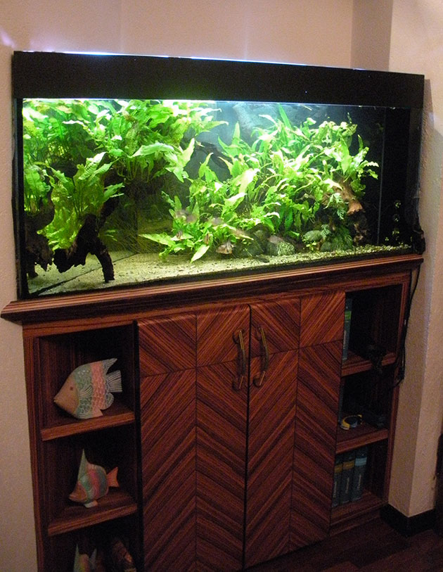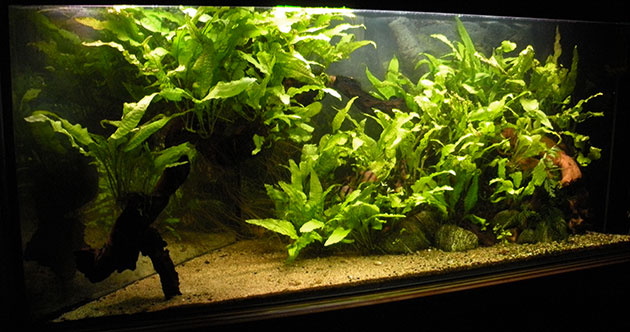 Ho allestito questa vasca per mio padre, lui voleva una vasca semplicissima da gestire e per nulla impegnativa, allora ho pensato che le epifite avrebbero fatto al caso suo… Il mio scopo era allestire un acquario semplice ma che fosse anche gradevole esteticamente (si trova all’ingresso della casa e quindi rappresenta un po’ un “biglietto da visita”), ricreando un angolo di fiume per i S. anchisporus. Mi piaceva l’idea di un acquario “selvaggio” e poco curato: come sappiamo tutti, in natura gli ambienti subacquei sono quanto di più lontano si possa immaginare da una vasca perfettamente curata e sempre in ordine…