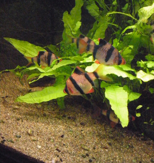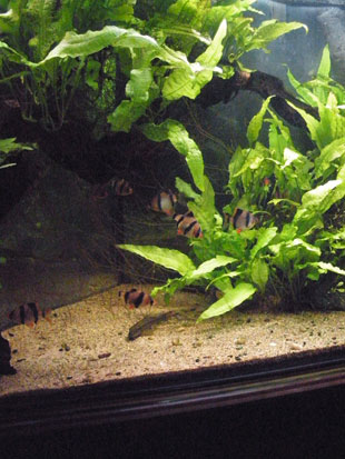 La fauna è costituita da 15 Systomus anchisporus e 1 Gyrinocheilus aymonieri, inoltre sono presenti Melanoides tubercolata in abbondanza e alcune Caridina multidentata provenienti da un’altra mia vasca smantellata. La flora è costituita unicamente da Microsorum pteropus , fanno eccezione due Bolbitis heudelotii inserite recentemente, anch’esse provenienti da un’altra vasca.
