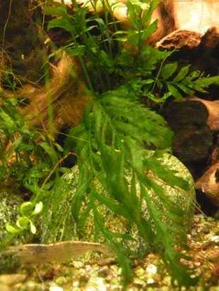 I valori attuali sono pH 7,2 GH 10 T 25 °C . L’acqua è abbastanza tenera, taglio l’acqua di rubinetto con osmosi, facendo 50 e 50, i cambi sono del 30% ogni 15gg. In questa acqua le Microsorum hanno sempre dimostrato uno sviluppo ottimale, a tal punto che a fine 2012 ho dovuto mettere mano per fare una pesante potatura, dato che le piante avevano cominciato a svilupparsi prepotentemente anche fuori dall’acqua (tra il coperchio e l’acqua) producendo grandi foglie trilobate che sono tipiche della forma emersa di Microsorum. Mi spiace molto di avere dovuto eliminare gran parte di quelle piante, ma non c’era spazio sufficiente per farle crescere emerse.Non era la vasca giusta per farlo. Spero di poter coltivare queste meravigliose felci emerse o semi-emerse in un futuro paludario, sicuramente più idoneo da questo punto di vista.