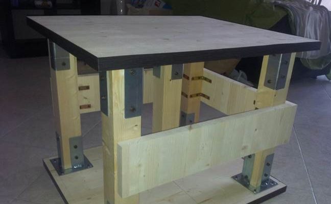 FASE 2: capovolgere la struttura, inserire le 5 travi e fissare gli altri 5 supporti reggitrave alla seconda tavola, quella di appoggio. Fissare le travi ai reggitravi con le viti. Controllare poi con la livella che lo scheletro del supporto sia perfettamente “a bolla”! Se necessario, stringere maggiormente le viti per equilibrare e livellare perfettamente la struttura. Inutile dire che per essere perfettamente “a bolla”, le 5 travi devono avere tutte esattamente la stessa altezza (50 cm. nel mio caso) e la tavola non deve essere storta. Massima cura quindi nella scelta e nel taglio del materiale!