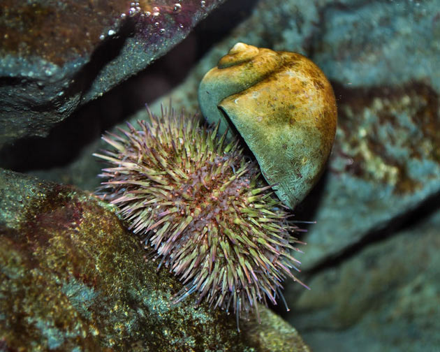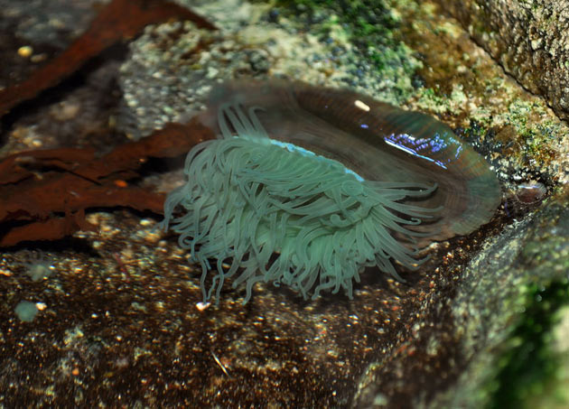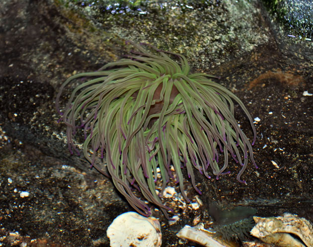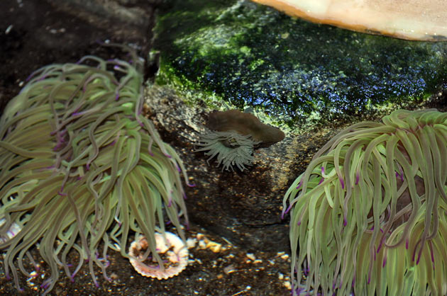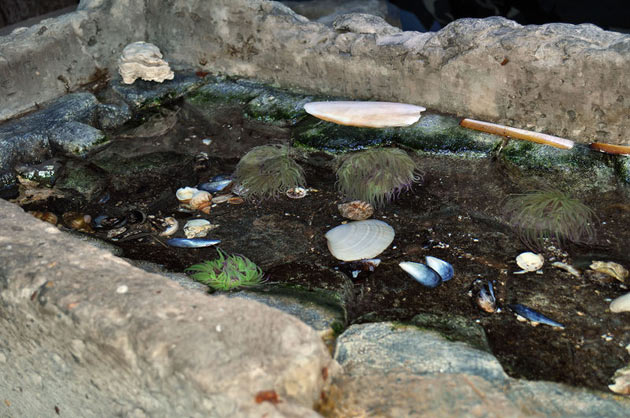La prima “camera” è in penombra, luce molto piacevole e rilassante, c’è una piccola vasca che simula una pozza di marea con anemoni , cozze e altri animali del genere.